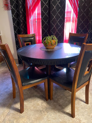 Het is ontworpen voor ronde tafels, maar dankzij het stretch-fit ontwerp past het op verschillende maten.