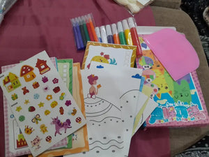 De speelset bevat diverse materialen zoals stiften en stickers, die kinderen helpen hun creativiteit en verbeelding te uiten.