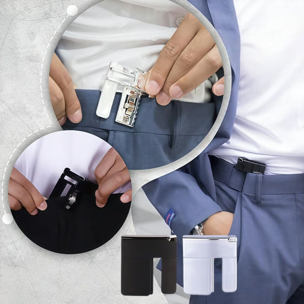 Bevestig de clip eenvoudig aan de tailleband van je broek of rok en pas de spanning aan voor een comfortabele en naadloze look.
