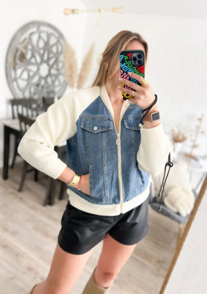 De jas is gemaakt van een hoogwaardige mix van denim en polyester, wat duurzaamheid en comfort garandeert.