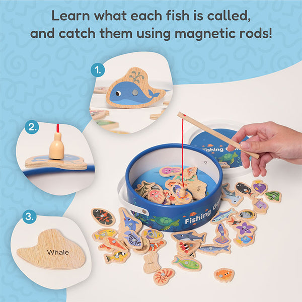 Bevat: (51) houten vissen, (3) magnetische staven, (1) emmer