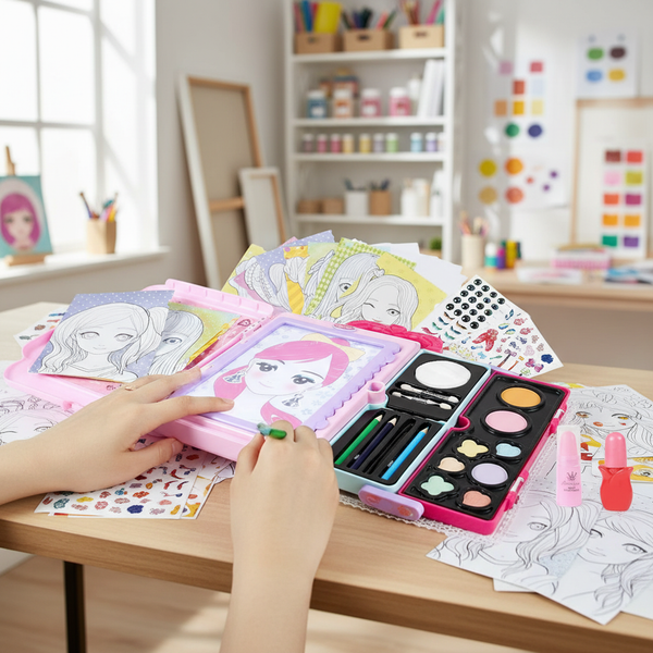 GlamSketch™ maakt knutselmomenten eenvoudig en plezierig. Vaders kunnen snel opzetten, samen tekenen en direct kleuren toevoegen met veilige waterbasis make-up zonder rommel.
