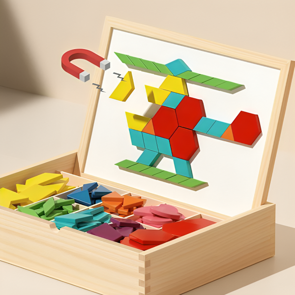Gemaakt van duurzaam hout en sterke magneten, biedt het set veilig aanraken en manipuleren. Kinderen ontdekken vormen zonder scherpe randen of los plastic.
