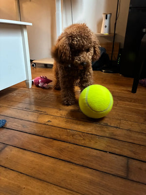 De extra grote diameter is ideaal voor middelgrote en grote honden die moeite hebben met kleine ballen. Kleine honden genieten ook van duwen en rollen.