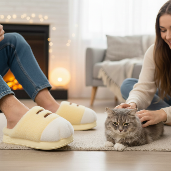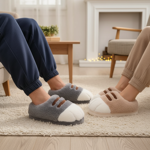 PurrStep⢠combineert pluche zachtheid en anti-slipzolen voor warme voeten, minder koude stress en ontspannen avonden zonder uitglijden