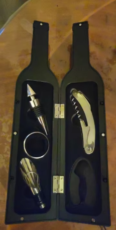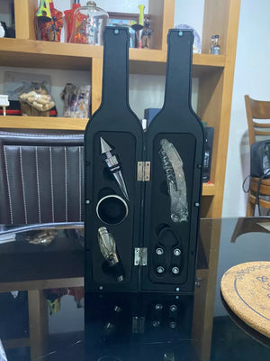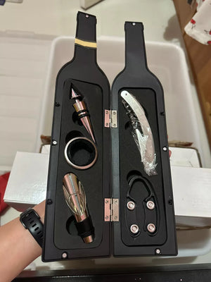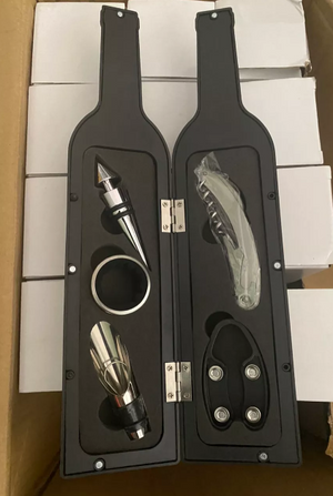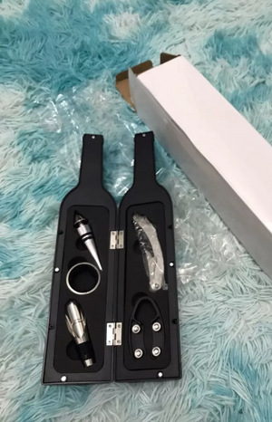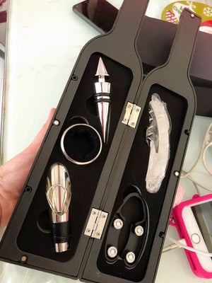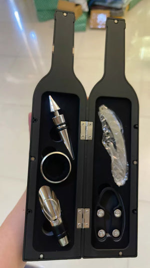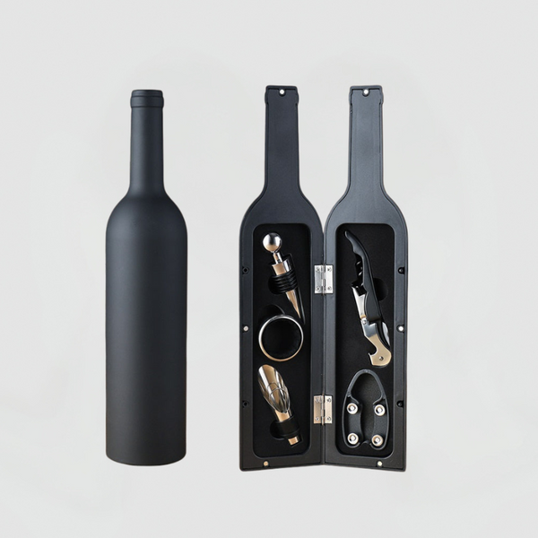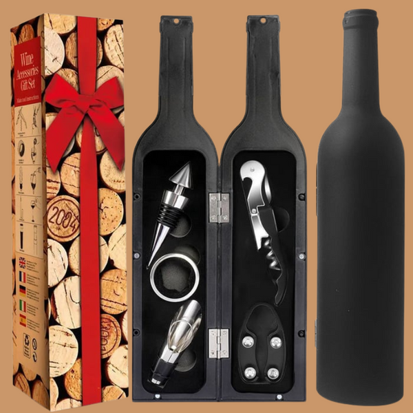 De set bevat een kurkentrekker, wijnstopper, foliesnijder, schenktuit en een druppelring, allemaal stijlvol verpakt.