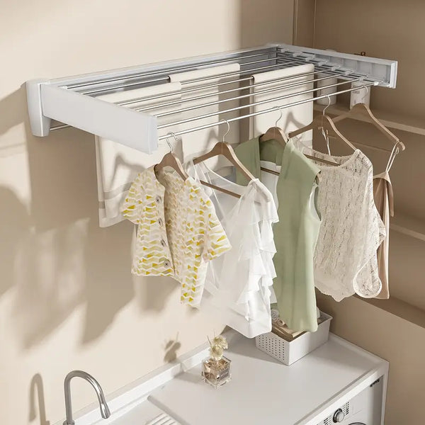 Met de FoldLine™ Slimme Opvouwbare Waslijn transformeer je je wasruimte in een georganiseerde oase. Geniet van een opgeruimd huis dankzij het slimme ontwerp dat moeiteloos tegen de muur vouwt. Ideaal voor kleine appartementen en balkons.